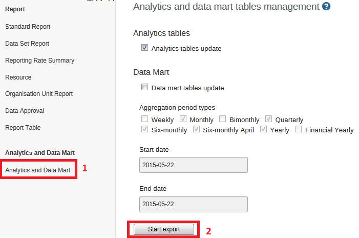 首先单击Analytics and Data Mart,然后单击标记为Analytics tables update的Start export复选框。