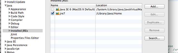 您为jre7:/Library/Java/Home配置的路径实际上指向了您的jdk6安装。将/Library/Java/Home更改为该命令的任何输出:/usr/libexec/java_home。