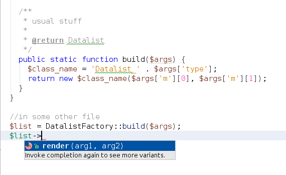 在PHPDoc for DatalistFactory::build()中,我应该把什么放在DatalistFactory::build()前面,以便IDE也提示在子类中定义的函数。