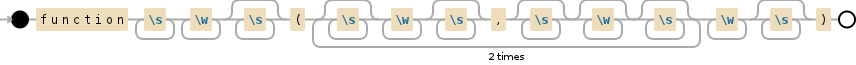 function搜索function关键字。\s+\w+,这个组用于标识函数的名称:可以定义一个没有名称的http://en.wikibooks.org/wiki/JavaScript/Anonymous_Functions,所以这个组必须是可选的。\s*\(有一个任意数目的空格和一个括号来打开参数列表;[^,)]* (不包含逗号或结束括号的字符序列)。\s*,\s*模式强制执行的(\s*实际上是不必要的)。接下来,一个参数名称的组,当然,我们需要跳过至少两个逗号。发布于 2015-05-12 20:41:38