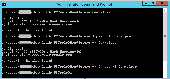 listdll.exe -d ComHelper.dll 也许就是你要找的。句柄似乎专注于打开的文件,而不是加载的dll。listdll是一个可以从sysinternals下载的工具。