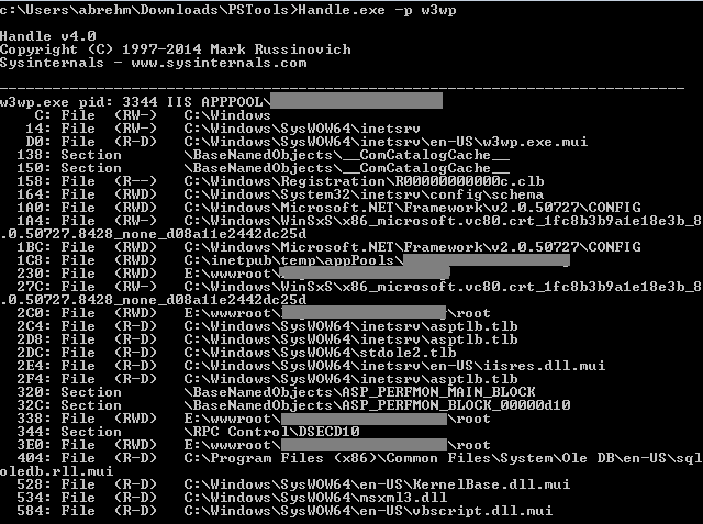我怀疑你遇到了访问问题。您是否从提升的命令提示符中运行句柄?您能否在w3wp.exe中获得任何输出覆盖句柄(通过在handle.exe命令行中使用进程的pid )?