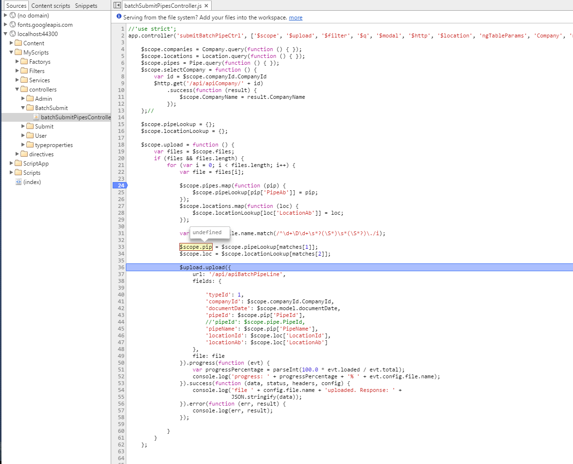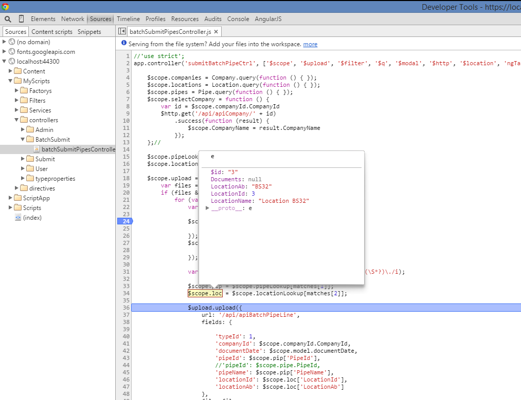 $scope.loc = $scope.locationLookup[matches[2]];locationLookup正在匹配位置缩写并将其放置在$scope.loc变量中。然而,pipeLookup不起作用。当然,它是抛出错误,因为管道属性是未定义的。我不知道我是不是刚看完什么东西。如果需要更多的信息,请告诉我