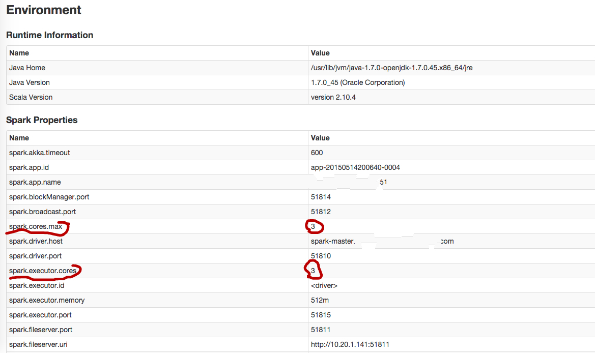 我的星盘集群有一个主服务器和三个工作人员(在4台不同的机器上,每台机器上都有一个核心),其他设置如下图所示,其中spark.cores.max设置为3,spark.executor.cores还设置了3 (在pic-1中)。