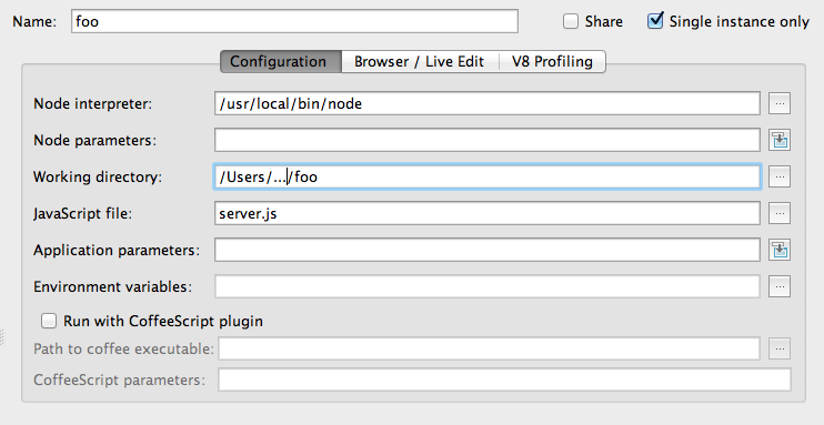 2- Run->Edit Configuration提供节点路径、工作目录和JavaScript文件"server.js“,如下所示: