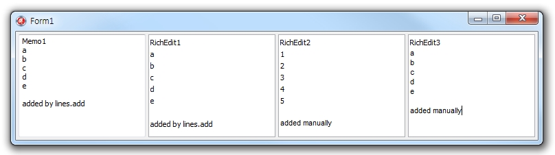 当我手动输入一个字母表时,行空间会自动减少,但是当我使用tRichEdit.lines.add时,什么都不会发生。