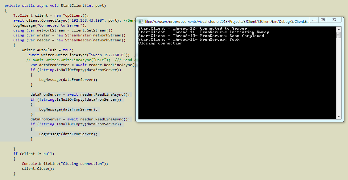 writer.WriteLineAsync("Sweep 192.168.0"))writer.WriteLineAsync("FromServer: Initiating Sweep"))reader.ReadLineAsync())client.Close())修复方法是不要过早地关闭连接并等待服务器消息的其余部分。甚至简单地添加两个ReadLineAsync()行就可以修复它。