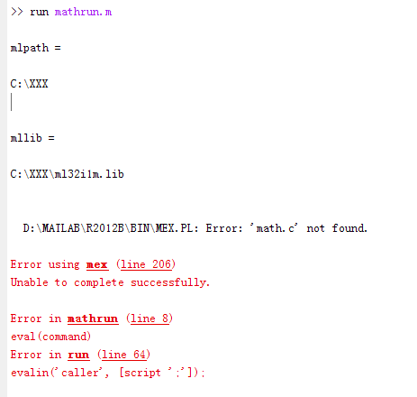 路径似乎没有正确地传递到mex,所以它找不到math.c。评论原文: