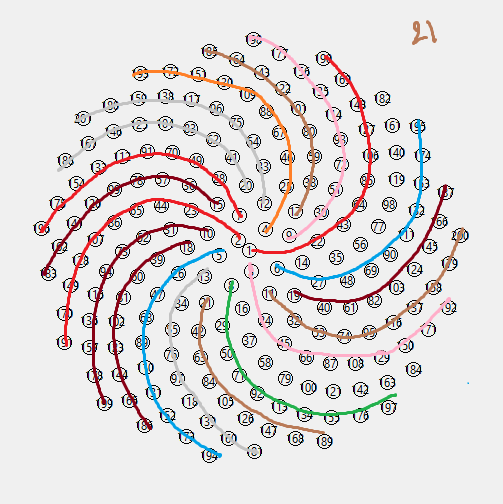 我试着用平纹机画出一朵斐波那契向日葵。这是正确的绘图,但我也希望能够绘制螺旋。然而,我不知道如何正确地连接它们。有什么想法吗?