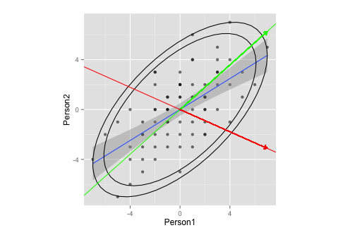 g <- g + geom_segment(aes(x = 0, y = 0, xend = max(df), yend = eigen$vectors.scaled[1,1] * max(df)), colour = "green", arrow = arrow(length = unit(0.2, "cm"))) # add arrow for pc1