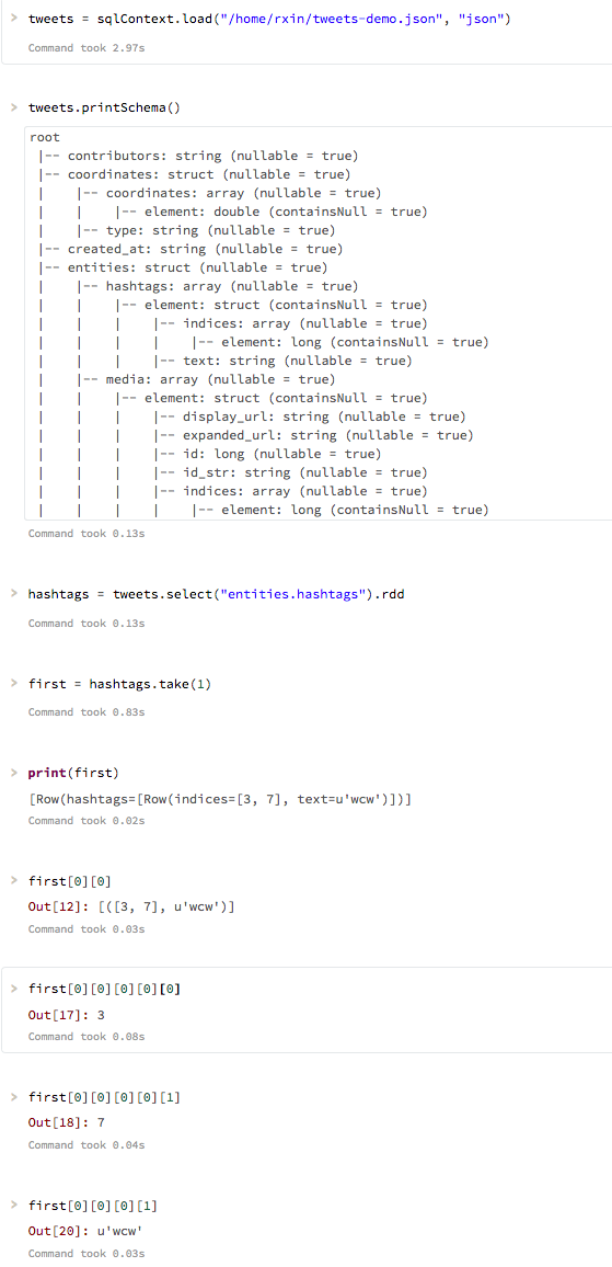tweets.registerTempTable("tweets")接下来,我只使用以下行对hashtag实体进行了示例:
