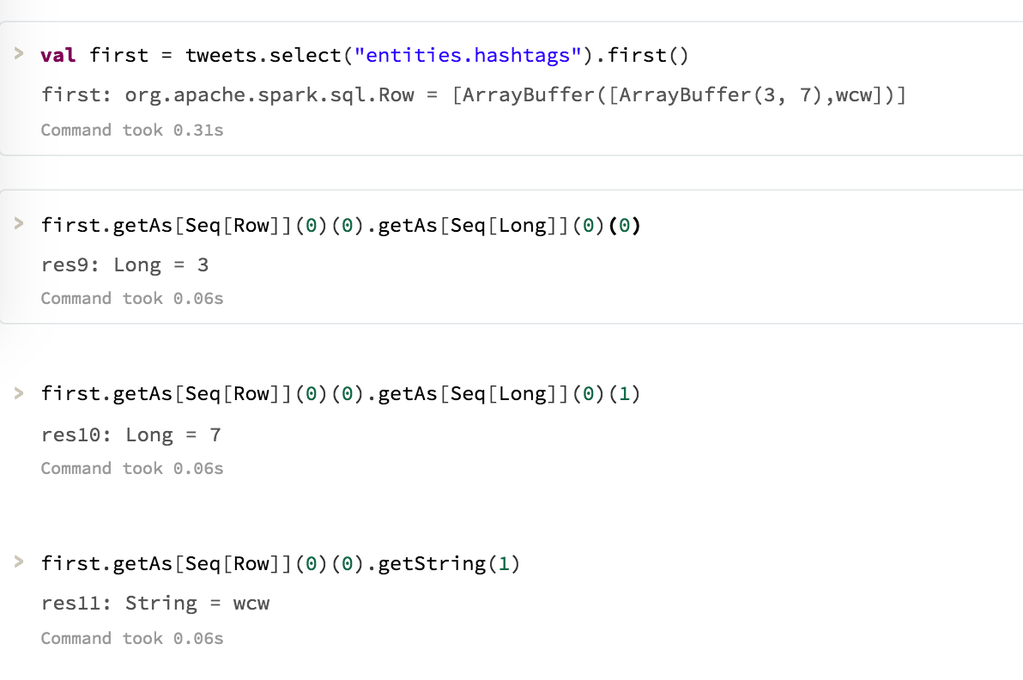 val hashtags = sqc.sql("SELECT entities.hashtags FROM tweets LIMIT 3")