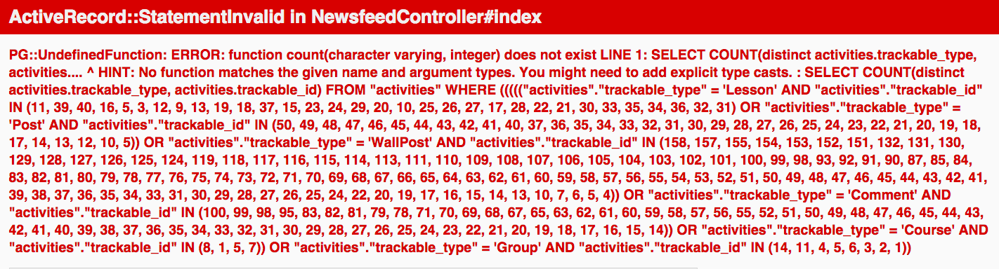 PG::SyntaxError: ERROR: syntax error at or near "ON" LINE 1: SELECT COUNT(DISTINCT ON(trackable_type, trackable_id) *) FR... ^ : SELECT COUNT(DISTINCT ON(trackable_type, trackable_id) *) FROM "activities"发布于 2015-05-25 13:30:32
