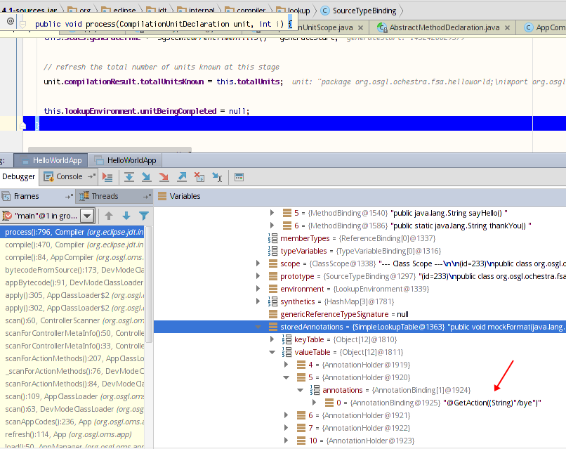 }因此,很明显,ECJ编译的字节码中缺少注释@GetAction("/hello") (在内存编译中)。