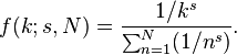 然后Zipf定律预测,在N个元素的总体中,秩k,f(k;s,N)的元素的频率是: