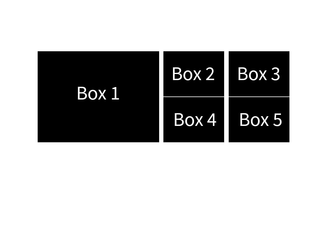 我想用Flexbox来构建我的网格,然后再加一点。如何设置一个盒子和向右边的多个盒子的一半大小的盒子1。方框2-5然后应该浮动到框1。