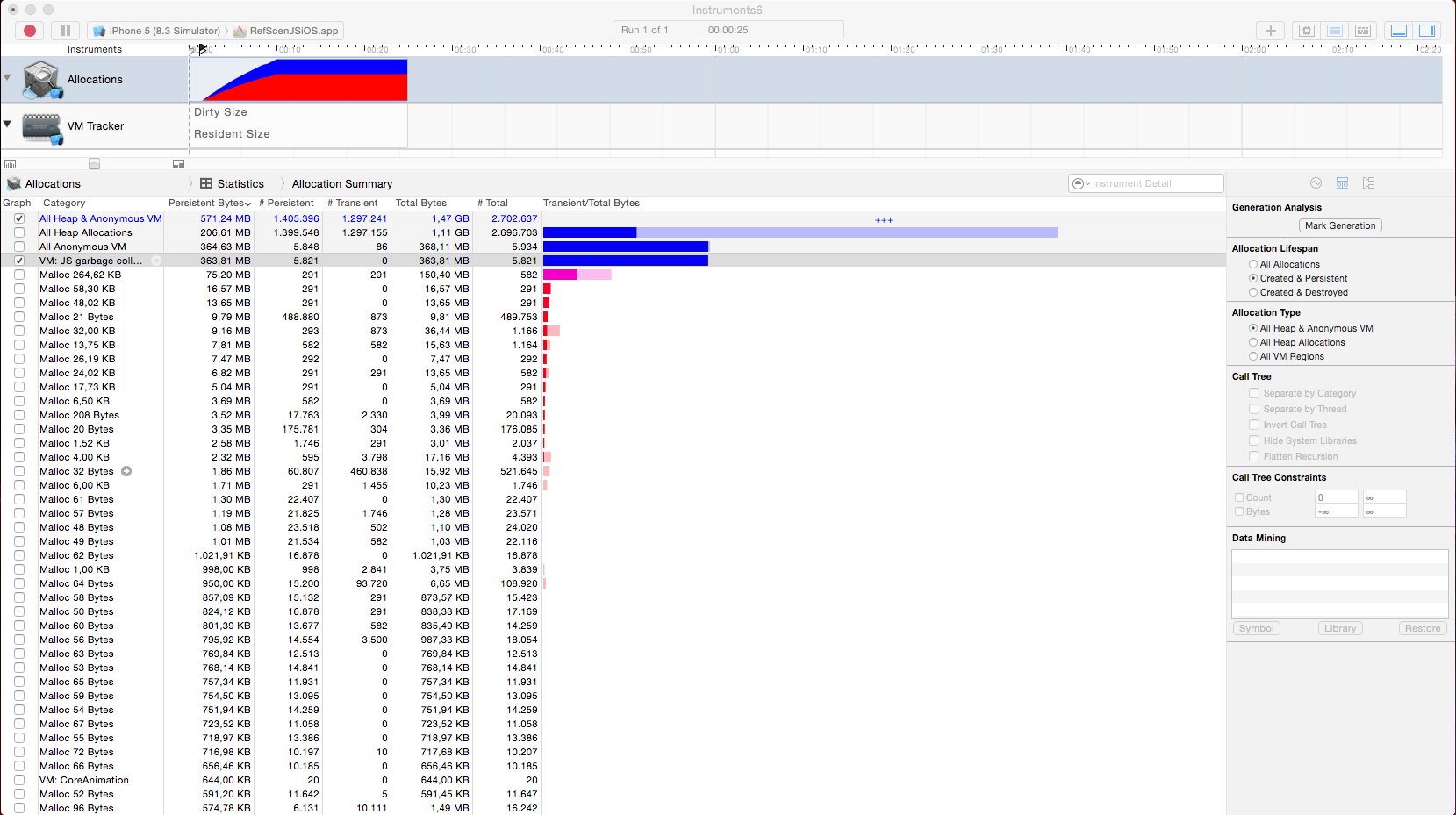 我正在与JavaScriptCore合作一个iOS Swift项目。我现在想用XCodes内部XCTest框架测试我的应用程序。现在,当我调用与JavaScriptCore类一起工作的方法时,它会生成一个JSContext + JSVM,给我我需要的东西,就这样。但是,当我在循环中调用此方法时,JS垃圾收集器似乎不是空的,而是保持所有调用处于打开状态,这将导致测试冻结在VM: JS垃圾收集器大约364 of的6k持久性分配上。即使我编写了手动去初始化方法,这种情况仍然会发生。