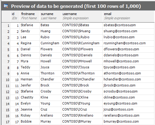 然后,我对用户名和电子邮件字段使用了“简单表达式”生成器。用户名生成器的表达式是'CONTOSO\\'+firstname[:1]+surname。对于电子邮件列,我使用的表达式是firstname[:1].lower()+surname.lower()+'@contoso.com'