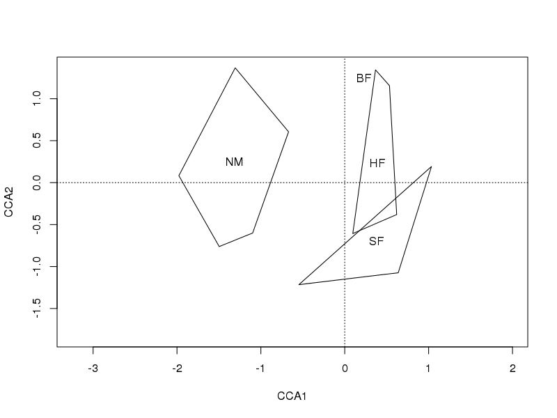pl <- ordihull(mod, Management, scaling = 3, label = TRUE)发布于 2015-05-28 17:25:45