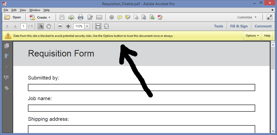 如果将data.xfdf和Requisition_Fillable.pdf放在同一个目录中,然后打开data.xfdf,您将看到以下消息: