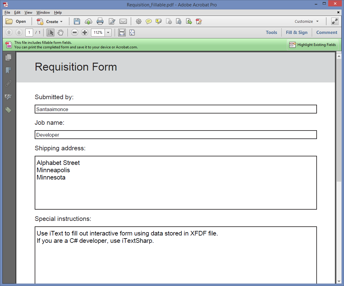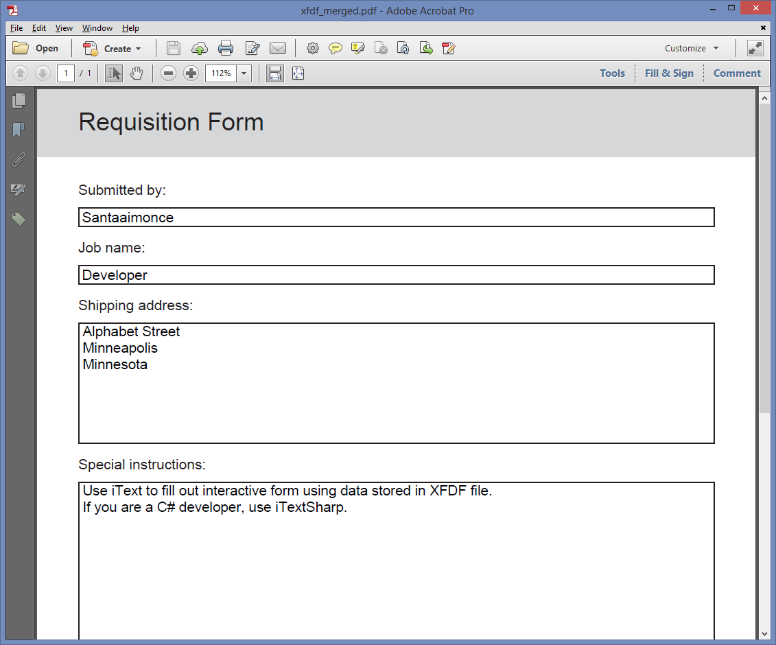 显然,这只有在表单(在本例中是Requisition_Fillable.pdf)与XFDF流中的数据相对应时才能工作。例如:我的模板将处理"Submitted by"和"Shipping address"字段的数据。它不适用于"Job Name"和"Special Instructions"字段,因为这些字段不存在于我的模板中。在我的模板中,这些字段名为"Job name"和"Special instructions";您看到的是小写而不是大写吗?