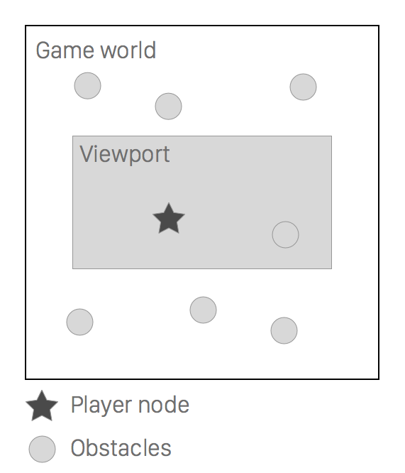 我的游戏需要滚动两个轴(x,y)。玩家节点从游戏区域的中心开始,可以被移动。有一些障碍散布在这个地区,其中一些最初是看不见的,因为它们位于“游戏世界”的边缘。