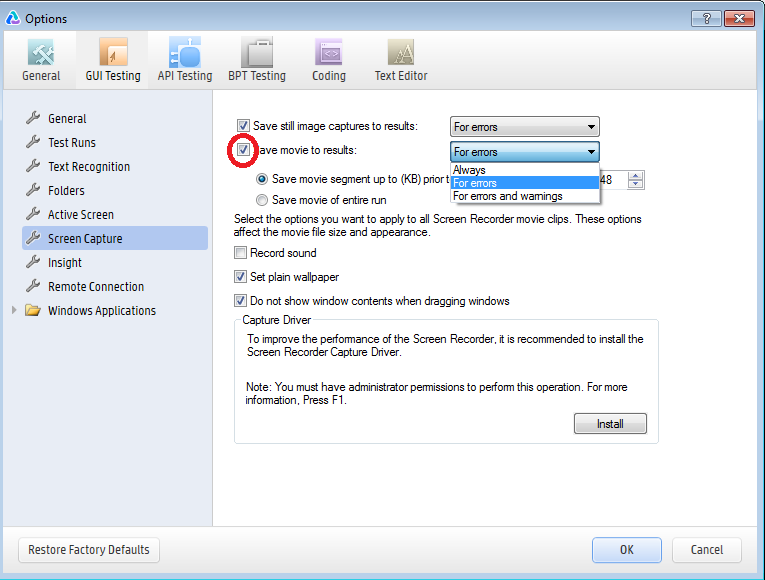 转到tools⇒选项,选择GUI测试选项卡和屏幕捕获项。然后选中“保存电影到结果”复选框,然后选择要保存电影的时间。