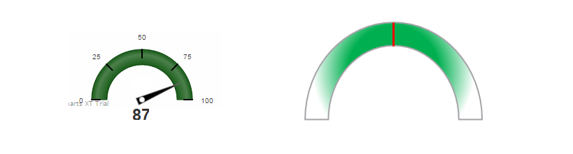 你可以看到在左边的图像,我要拨号值,是87在图表的底部。此外,我试图实现梯度颜色的量规图,同样的图像,你可以看到在右边。我正在努力理解gaugeFillMix和gaugeFillRatio是如何工作的。
