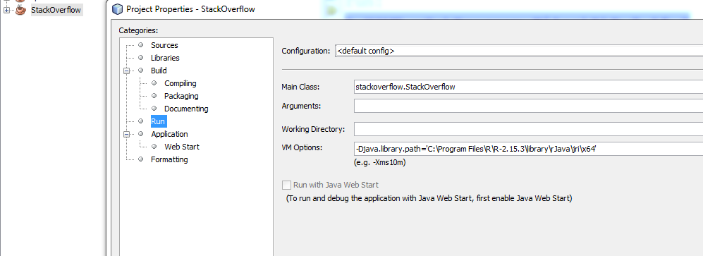 BUILD SUCCESSFUL (total time: 0 seconds)另外,您还需要设置D:\Program Files\R\R-3.2.0\bin\x64;D:\Misc\RLib\rJava\jri\x64 --您需要在vm选项中设置它,而不是作为环境变量。这是如何在Netbeans中完成的(这是im使用的):