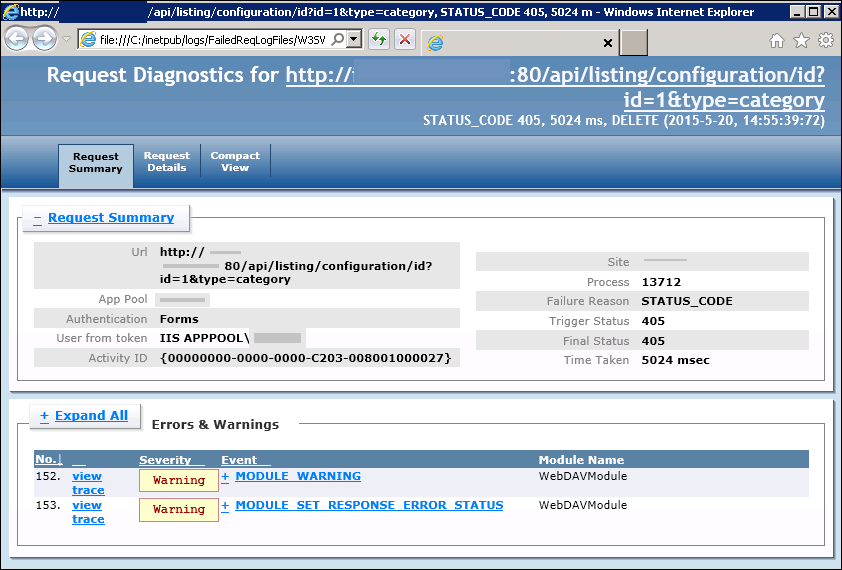 例如,上周FRT帮助我了解了一个客户端托管站点的问题。站点的一个特定部分(使用WebAPI)在发出HTTP请求时与405 Method Not Allowed状态代码失败,尽管允许使用DELETE谓词。
