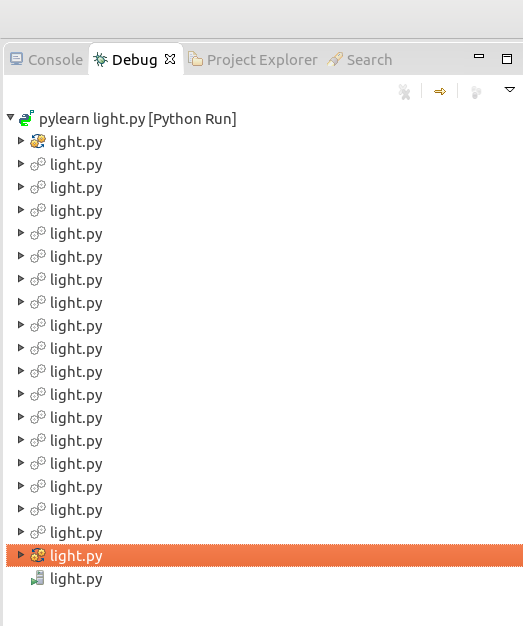 我在这里只是猜测,但是从PyDev中的输出来看,您似乎正在使用multiprocessing或创建python子进程的其他东西来执行某些操作(这就是为什么我认为每次调试器中都有一个新的light.py条目)。