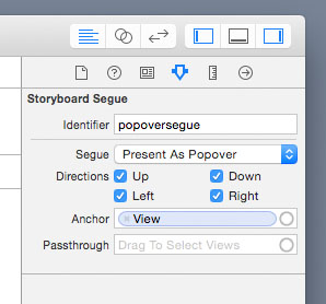 Xcode会坚持说popover有一个锚。错误信息是“没有锚的Popover segue”。这可以在属性检查器中解析-- Anchor属性。从圆圈拖动到您的视图。