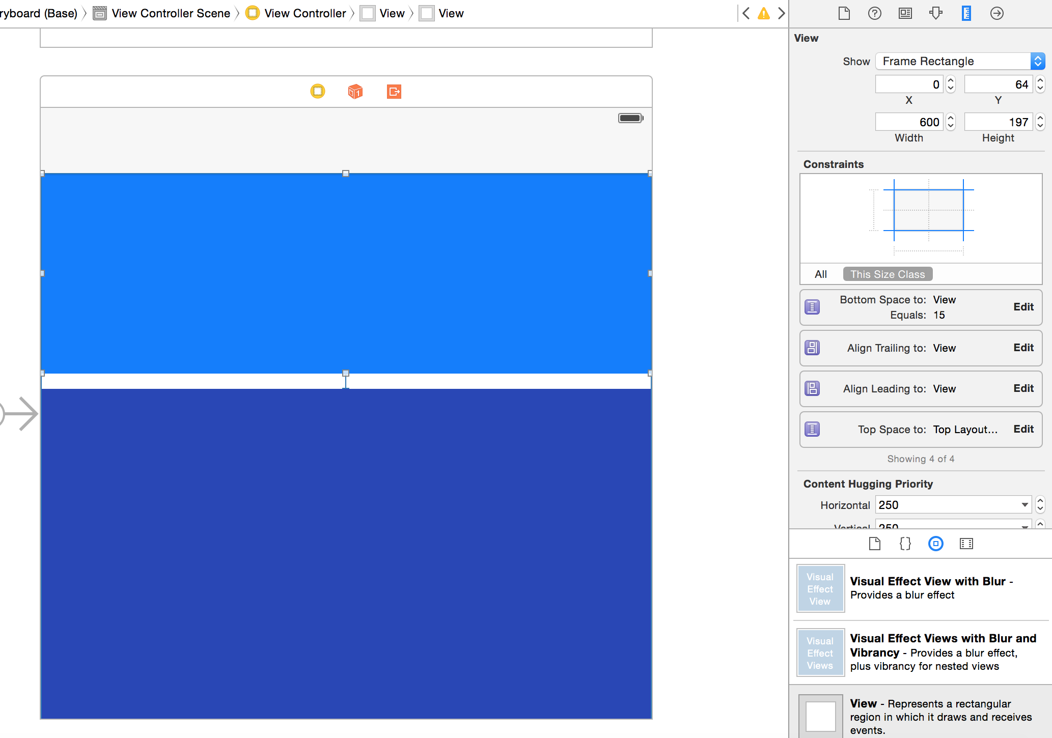 在上视图集中,左和顶约束,在下视图集设置底部,等宽,对齐前导和等高。设置两个视图之间的实际间距。