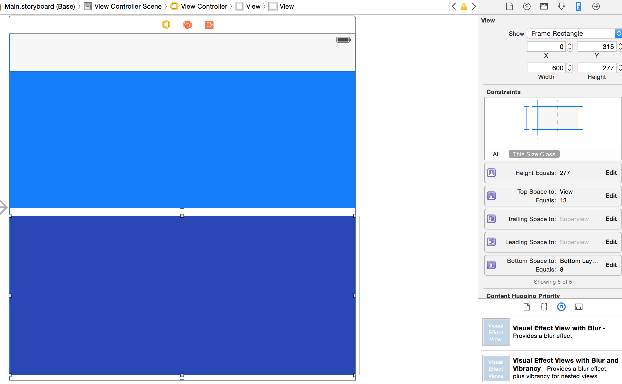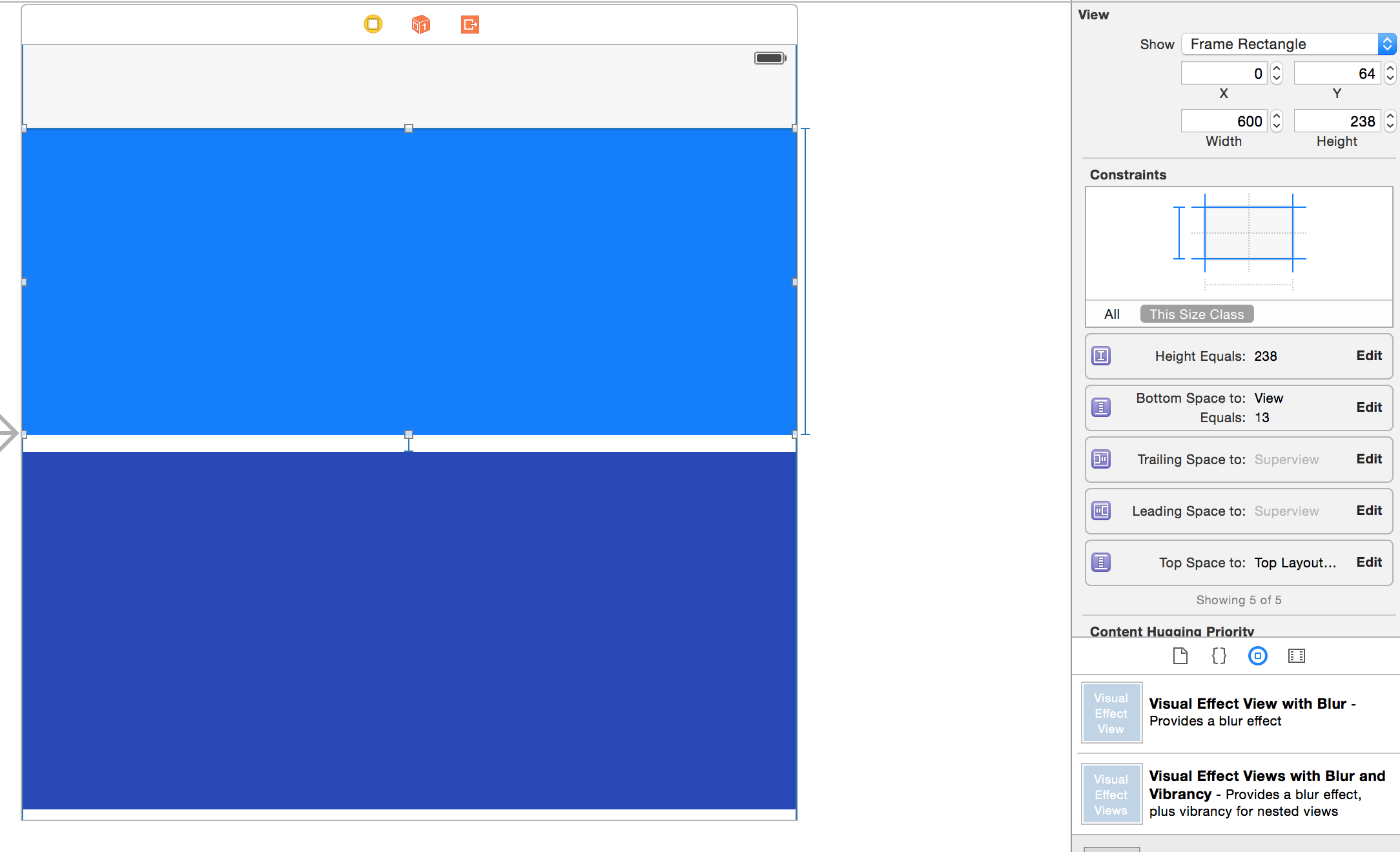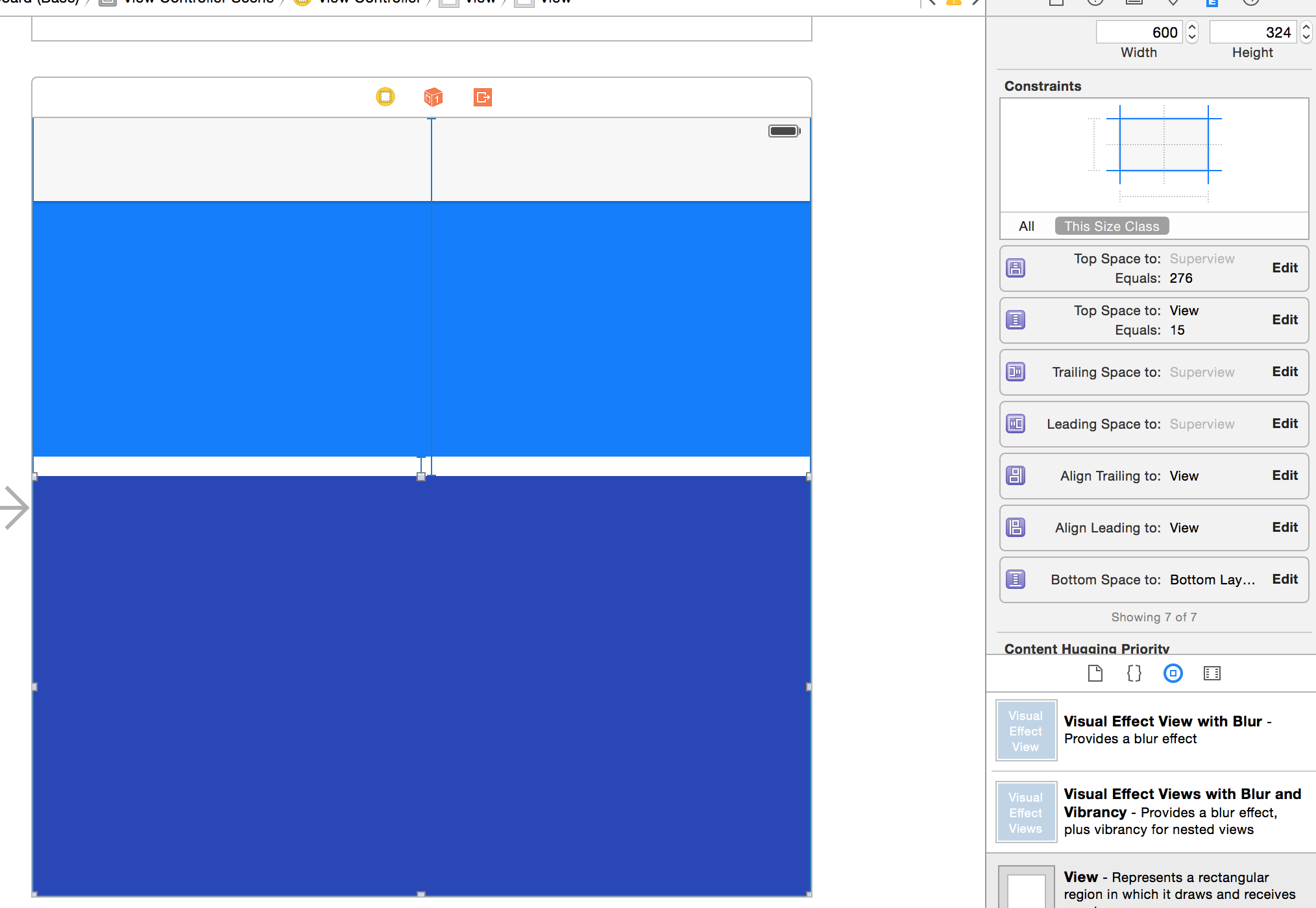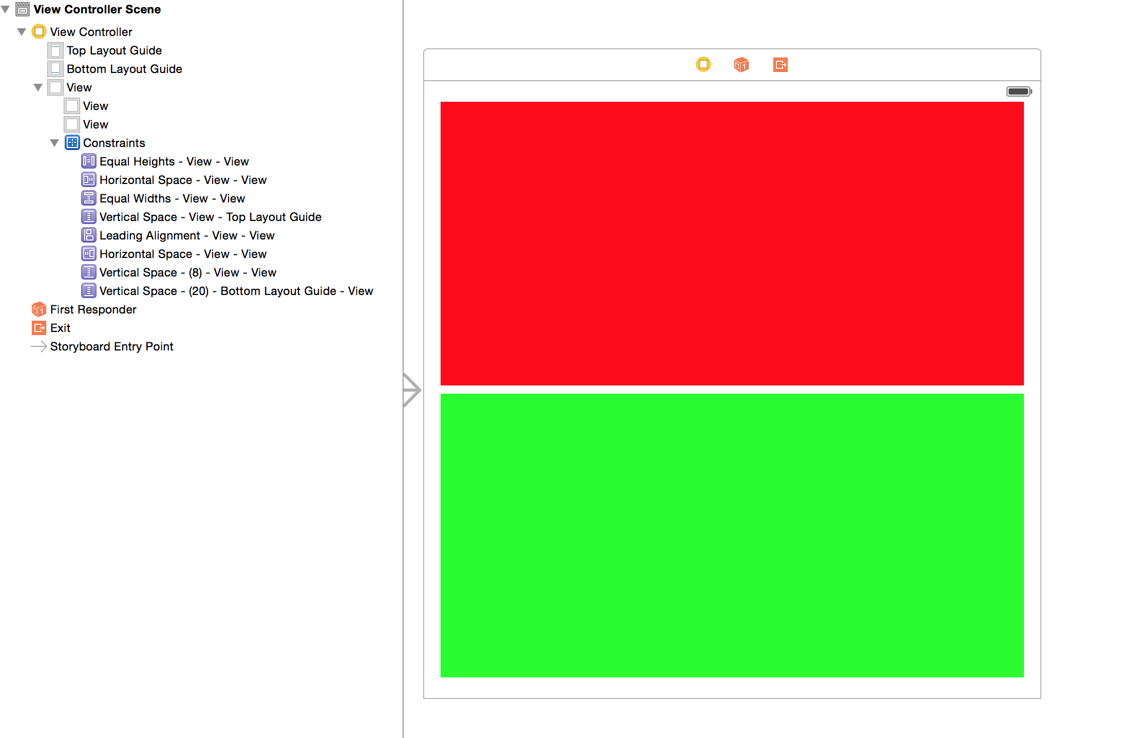 如果您希望这两个视图是相同的高度,给他们一个相同的高度约束,并消除约束之间的底部视图和顶部的超级视图。您可以通过选择两个视图并从pin菜单中选择“等高”来设置等高约束。如果希望它们不完全相等,可以编辑该约束,将乘数值更改为任何您想要的值。