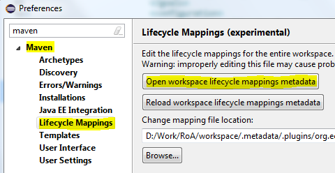 </lifecycleMappingMetadata>为了使其生效,请返回首选项,然后单击Reload工作区生命周期映射元数据。更新Maven项目和/或重新构建。错误应该消失了。