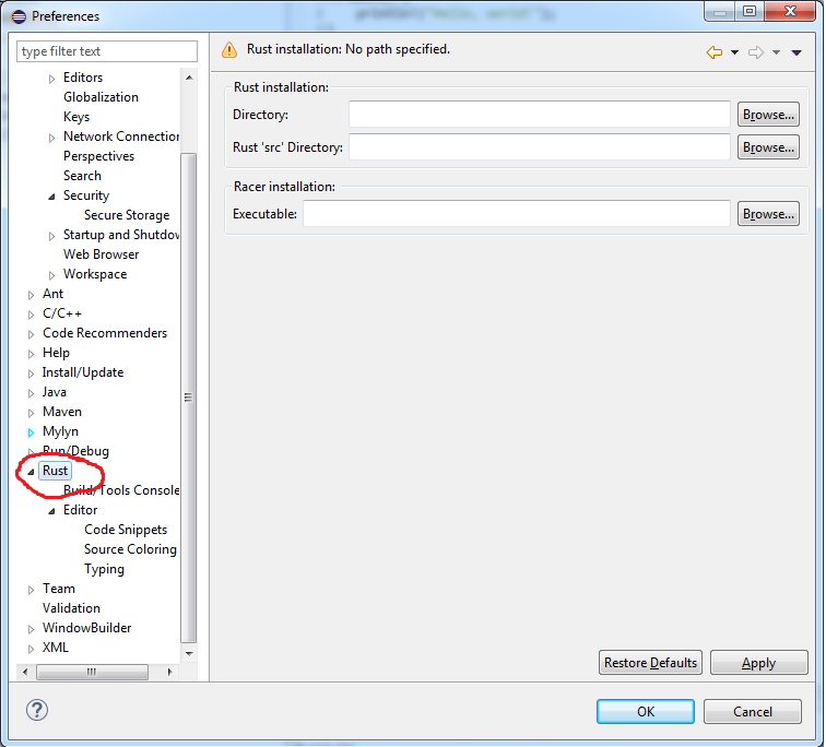 我在Eclipse中进入Preferences/Rust,但是我只看到文本/背景色和格式设置的选项。我可以在哪里链接到安装的路径?