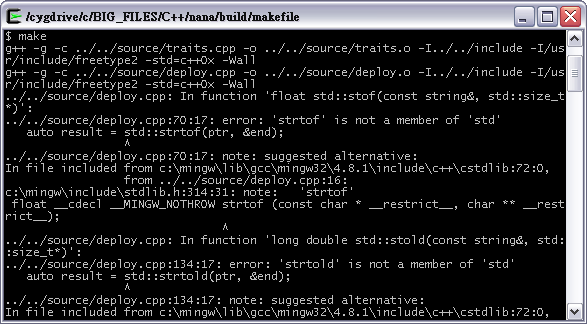 你的GCC版本太老了。然而,娜娜有逻辑认识到这一点,并围绕着它工作。我不知道为什么它没有正确地发现它。尝试使用build/makefile-bkl中的makefile,并使用make命令make CXXFLAGS=-DSTD_NUMERIC_CONVERSIONS_NOT_SUPPORTED来绕过它。