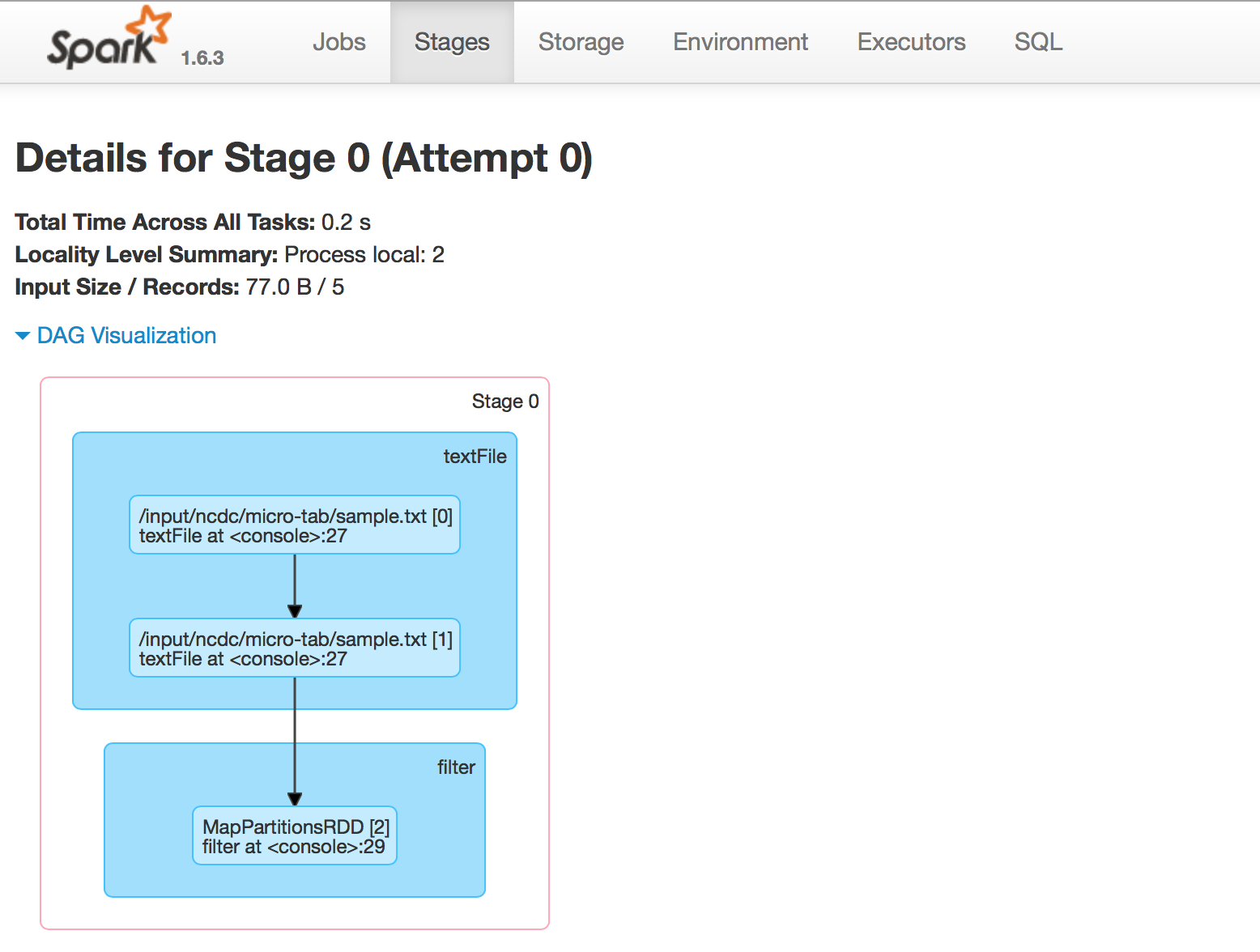 操作用于将结果保存到某个位置或显示结果。还可以使用命令filteredRdd.toDebugString(filteredRdd是这里的RDD )来打印RDD沿袭信息。此外,DAG可视化以非常直观的方式显示了完整的图形,如下所示: