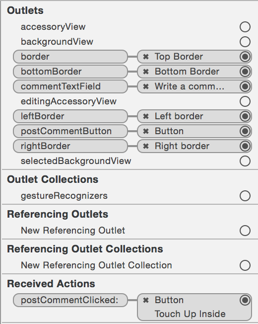另一个:您已经将您的出口连接到文件所有者,而不是连接到类。移除您的插座并将它们连接到类中。当您连接您的出口(从代码到元素,您将有空的圆圈),您将得到弹出的选择:文件所有者类。