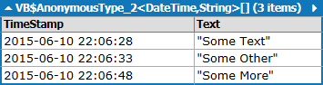 Select New With { .TimeStamp = timestamp, .Text = text } _