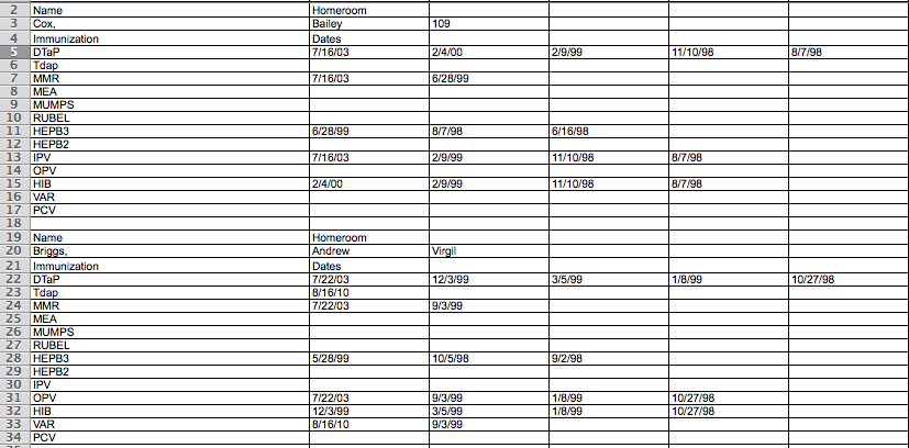 dtap dtap dtap dtap dtap tdap MMR MMR因此,对于第一个学生Cox,每个日期都需要跨越一行填写,每个免疫日期都有一列。