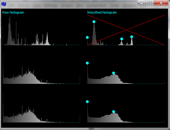 }pyx[y][x]和bmp->内容。pyx[y][x]是位图bmp的直接32位像素访问。bmp->Canvas是VCL封装的 GDI接口的位图bmp。xs,ys是位图分辨率tr和平滑sm以满足您的最佳需求如果有太多不同类型的直方图,则需要应用动态调整或不同的方法来查找峰值--这是直方图的外观: