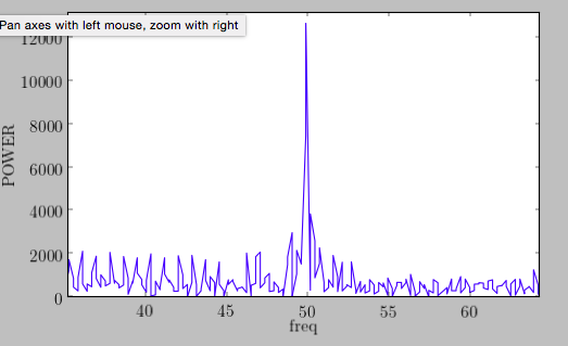 我有噪声的数据 (峰值周期1.8s,2048桶每周期),我想计算频率和删除50赫兹。我很确定我要找的频率是50赫兹,因为我用originlab找到它。