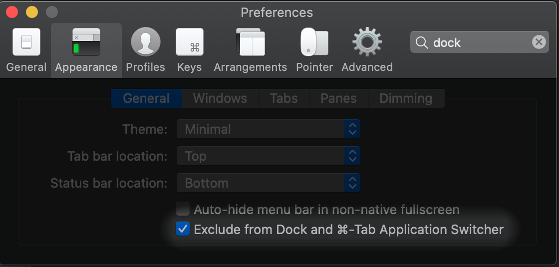 Hotkey Window并显示配置文件的首选项。这与选择Profiles > {Profile Name} > Keys > Hotkey Window和选择A hotkey opens a dedicated window with this profile相同。此选项将显示一个孤立的iTerm实例,而不是以前打开的所有内容。Preferences窗口。设置此热键的优点是,在选择iTerm选项时,可以快速访问所有的Exclude from Dock窗口。注意:不确定这是错误还是首选项,但是如果首选项窗口打开,iTerm失去焦点,则第一次输入热键组合时只会带来最新的活动配置文件。再按两次,就会返回首选项窗口。iTerm的工作人员也使访问Exclude from Dock设置变得更简单。只需前往Appearance > General并在底部找到选项Exclude from Dock。