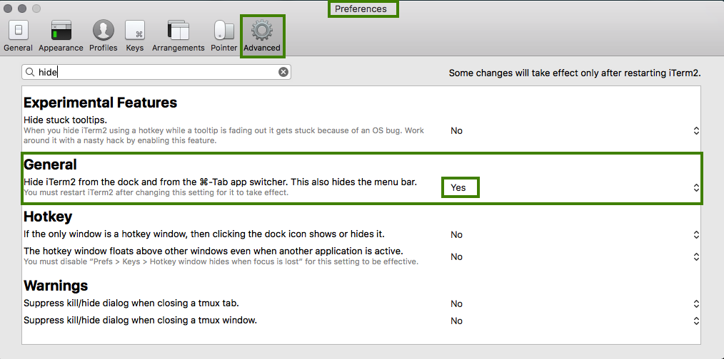 iTerm2 > Preferences并转到Keys选项卡。Hotkey Window作为显示和隐藏在下拉列表中的配置文件。此外,作为对罗恩回答的评论,Nishchal问,你是否可以隐藏应用程序,不让command + tab列表中运行的应用程序。遗憾的是,我没有足够的声誉将此响应作为对当前答案的直接评论,但以下是答案: iTerm2支持它的“高级”选项的一部分: