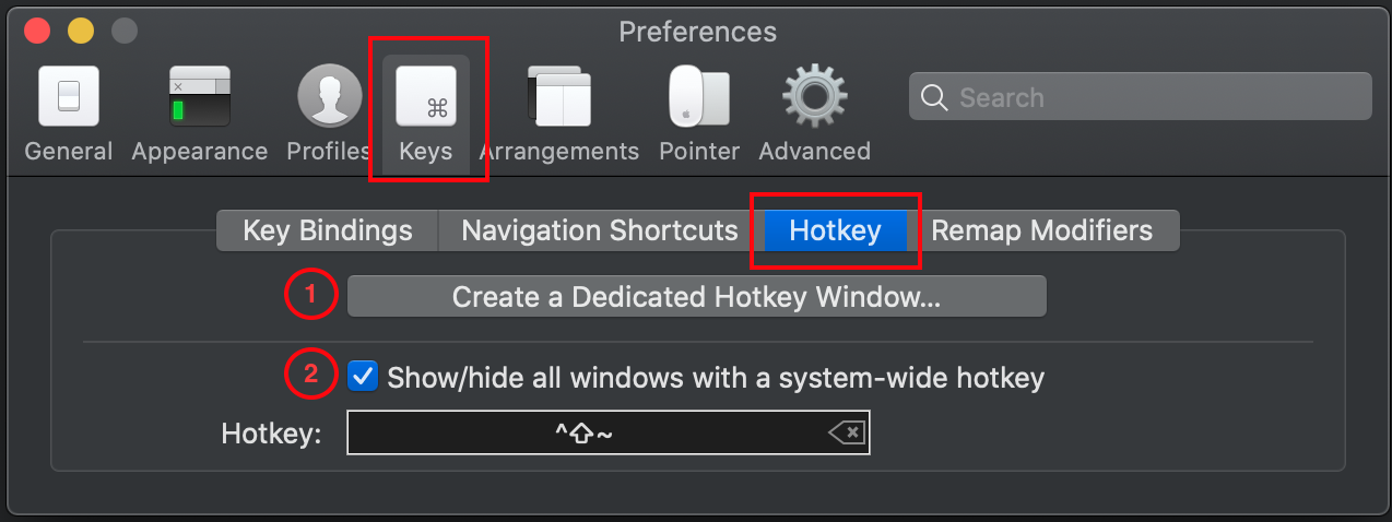 在iTerm 3.1.x和更高版本中,实现瓜克效果要容易得多,因为其中许多项已经移到了它们的专用子菜单中。有两种方法,您可以单独或同时使用,您可以选择最适合您的需求。这两种方法都可以在Preferences > Keys > Hotkey上访问。