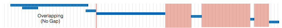 红色区块代表了我试图检测到的区域,同时忽略了重叠的基因(因为它们不会产生缝隙)。蓝色块显示chrII开始时的每个单独的基因。