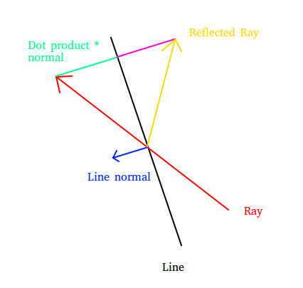 我有一张“射线”的桌子和一张“线”的桌子,我想让这些线在光线碰到一条线时就像镜子一样反射光线。想象一下,激光从镜子上反射出来,那种反射。我已经开始做交点检测了,但是我想不出如何正确地计算反射角度,以及如何把光线扩展到这个方向。