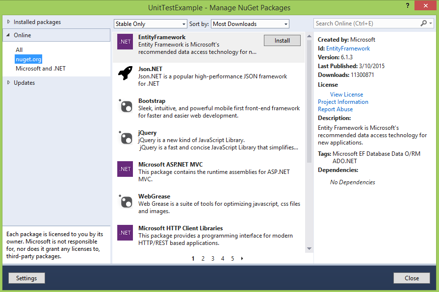 当您打开Manage包时,在online部分有"nuget.org“和"Microsoft.Net”