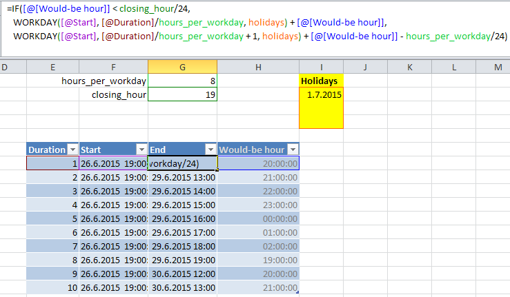 =IF(HOUR( F7+E7/24) >19,((F7+E7/24)-INT(F7+E7/24)-0.792)+(WORKDAY(F7,1,I:I)+0.417,F7+E7/24)